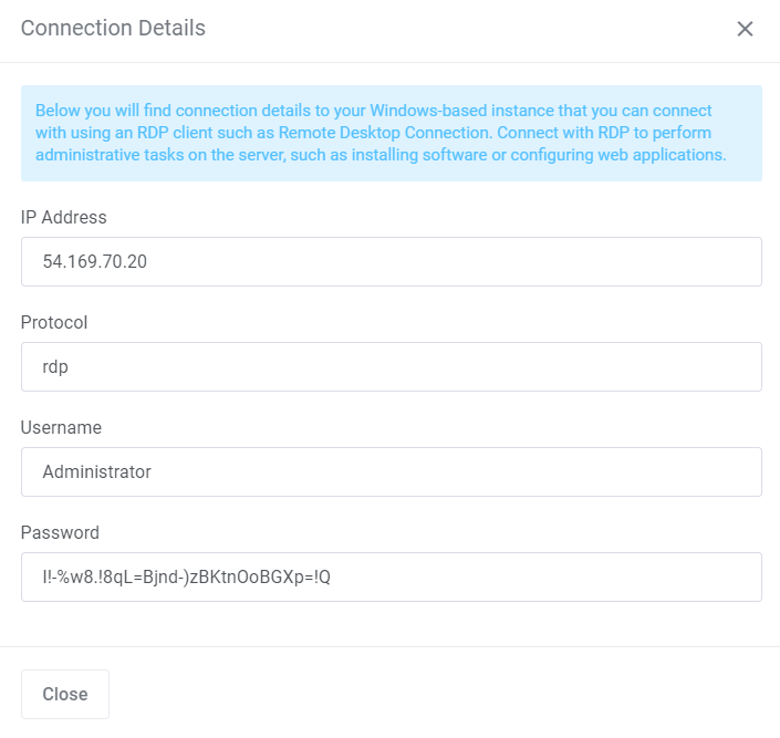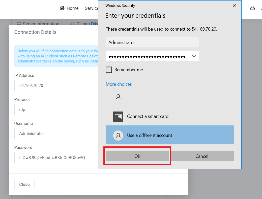 3. Log in via Remote Desktop Protocol (RDP) with IP, Username, and password