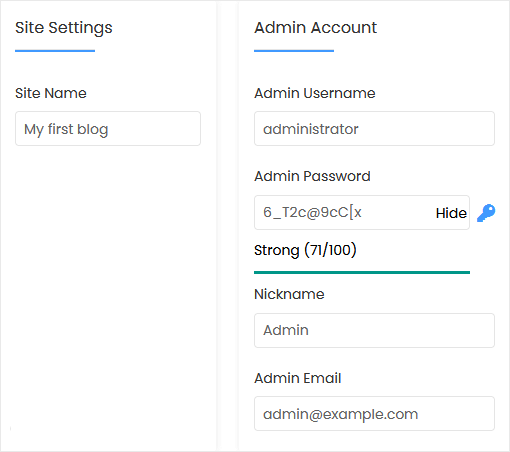 - Admin Username: Your new PivotX username (for security reasons, do not use the administrator or the admin username).