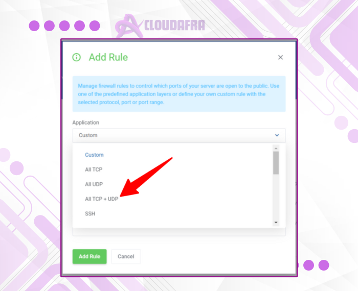 Enter the specific port number you want to open, or select All TCP + UDP if you want to allow all ports.